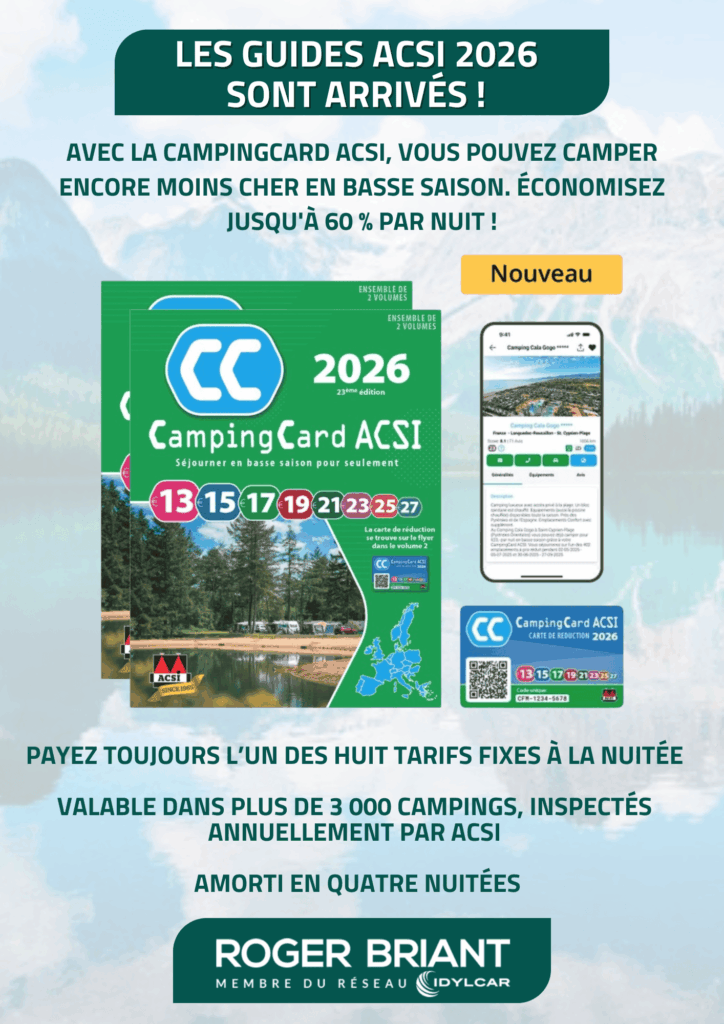 C’est avec grand plaisir que nous vous annonçons l’arrivée du Guide ACSI 2026 dans notre magasin Roger Briant ! Chaque année, ce guide devient un incontournable pour les amoureux du camping, et cette édition 2026 ne fait pas exception. Vous y trouverez toutes les informations essentielles pour planifier vos séjours dans les meilleurs campings d’Europe et au-delà, avec des détails pratiques, des recommandations et des astuces pour un séjour réussi.